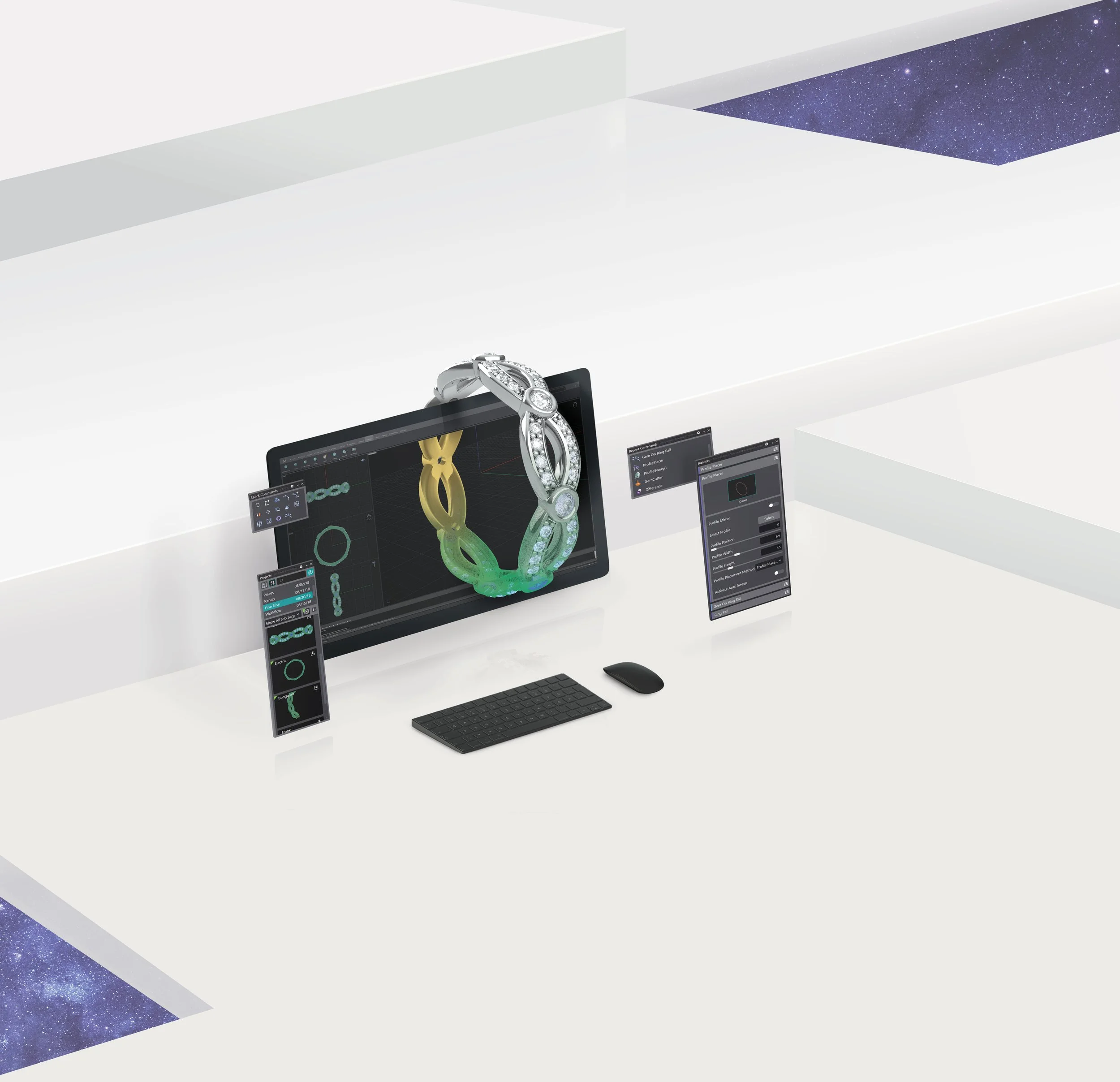 To introduce the product visually, we created a hero image featuring a 3D jewelry model rising directly from the design interface against a cosmic backdrop. The composition symbolized infinite creative potential powered by advanced engineering.
